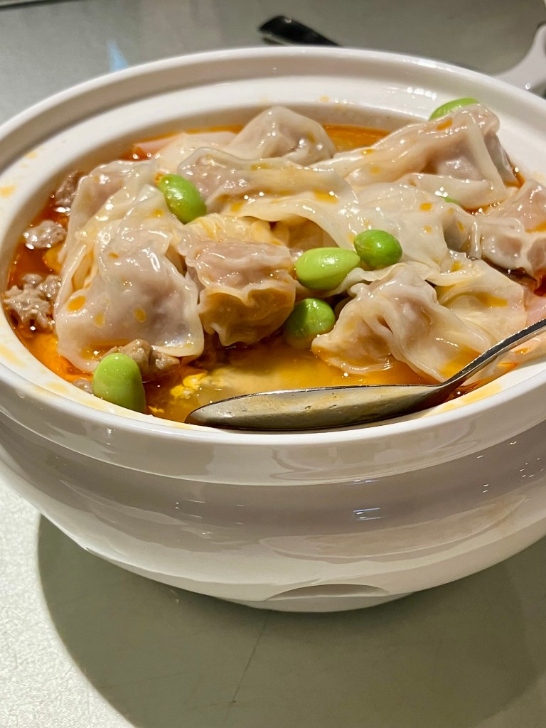 ピリ辛スープに入った臭豆腐をワンタンと一緒に食べると